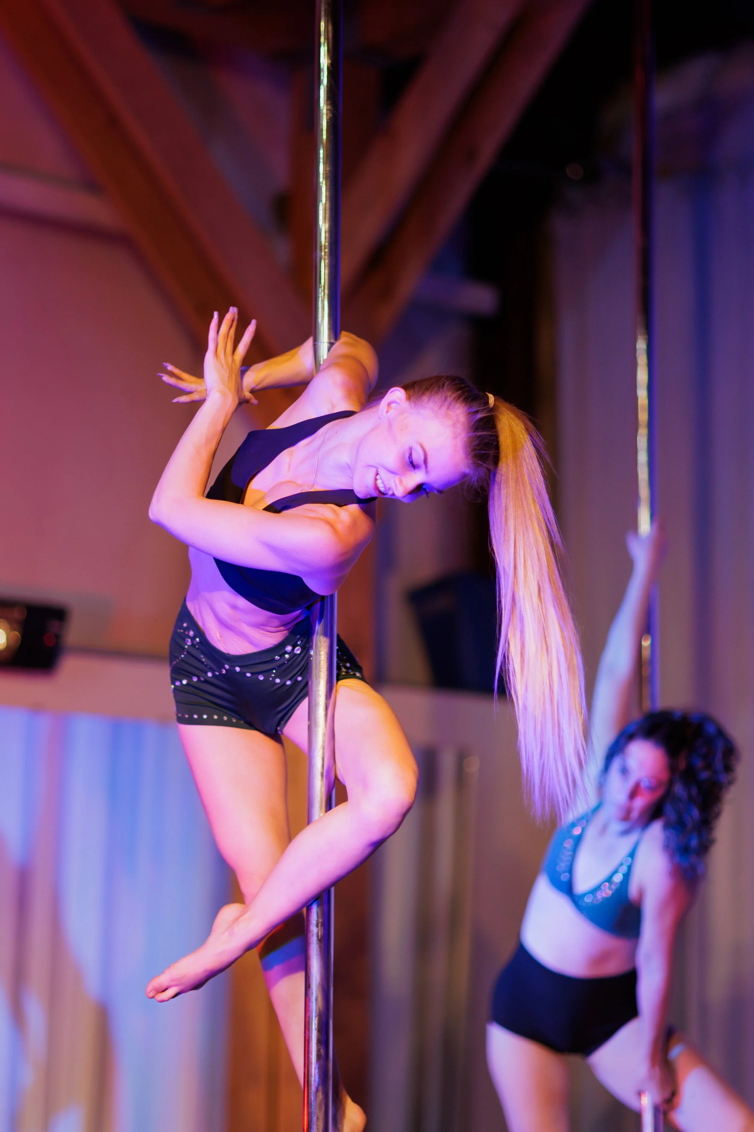 Tyler (she/her) primarily teaches intermediate level pole classes at Momentum.